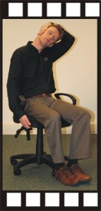Grasp leg or seat of chair with right hand. Place palm of left hand above right ear so that the hand passes behind head. Pull head to left, laterally flexing the neck.