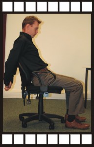 Clasp hands behind back. Reach out backwards over chair back whilst expanding chest and arching your back and lifting hands.
