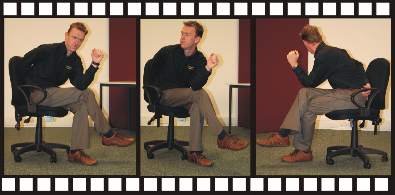Turn head neck and shoulder to the right as far as they will go, pressing with the left elbow.