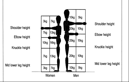 Each box in the diagram contains a guideline weight for lifting and lowering in that zone. The diagram shows the horizontal positions of the hands as they move the load. You can see that the guideline weights are reduced if the handling is done with the arms extended or are at high or low levels, as that is where injuries are most likely. When handling a load, it is necessary to decide on which box the handler’s hands pass through when moving the load. Then assess the weight being handled. If it is less than the figure given in the box, then the operation is within the guidelines. If more then there is a forseeable risk of injury and further risk assessment needs to be carried out.